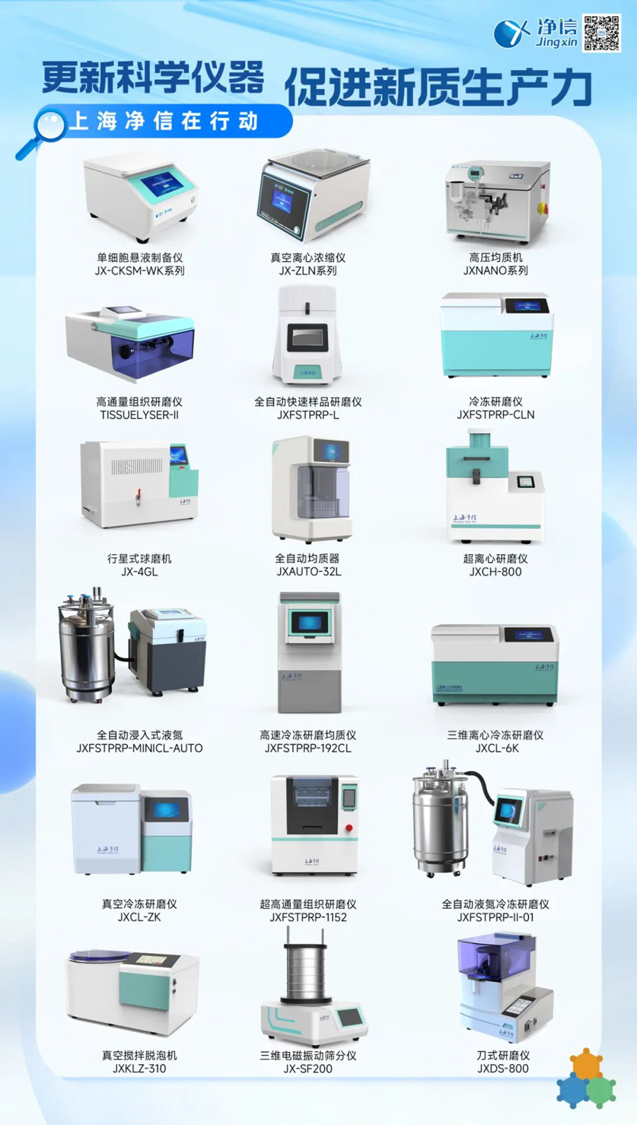 在國家大規(guī)模設(shè)備以舊換新的政策推動下,上海凈信積極響應(yīng),推出了一系列優(yōu)質(zhì)的實(shí)驗(yàn)室前處理設(shè)備,助力科研工作者提升實(shí)驗(yàn)效率,推動科研創(chuàng)新。上海凈信的實(shí)驗(yàn)室前處理設(shè)備涵蓋了樣品破碎、混合、分散、均質(zhì)化等多個(gè)環(huán)節(jié),能夠滿足不同實(shí)驗(yàn)室的多樣化需求。