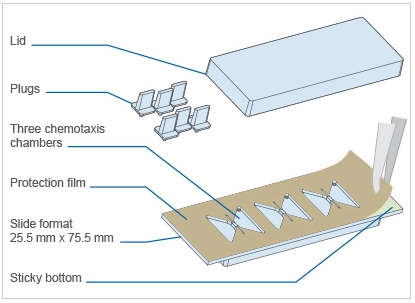 Introduction:A chemotaxis bottomless slide used in 2D and 3D applications with a self-adhesive underside designed to allow self-assemblage of the slide setup Versatile – i.e., permits the mounting of a variety of bottom materials