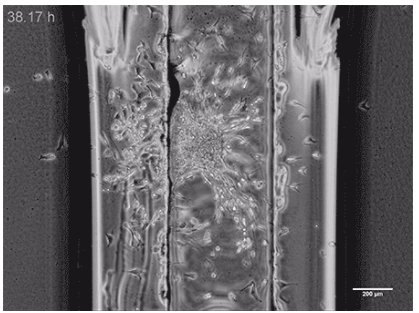 This movie shows the invasion of MCF-7 cancer cells into a collagen gel during 48 hours. The center channel of a sticky-Slide Chemotaxis was increased in height by milling in order to position the MCF-7 spheroid. The left side contains 10% fetal calf serum, the right side is serum-free. Phase contrast microscopy, objective lens 4x.