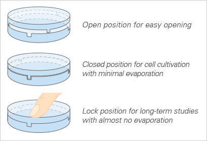 All ibidi μ-Dishes are equipped with a special lid-locking feature. The locking position minimizes evaporation and thereby provides excellent conditions for long-term studies in a non-humidified environment. Gas exchange (carbon dioxide or oxygen) during cell culture is maintained thanks to the gas-permeable polymer material of the dish.