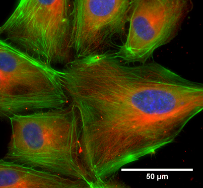 Fluorescence microscopy of human endothelial cells (HUVEC) in a μ-Slide 18 Well ibiTreat. Red: alpha-tubulin, green: F-actin, stained with LifeAct-TagGFP2 Protein; blue: nuclei (ibidi Mounting Medium with DAPI). 60x objective lens, oil immersion.