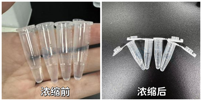 樣品濃縮前(每管200μL),濃縮1小時(shí)剩余(53μL,51μL,50μL,49μL)。