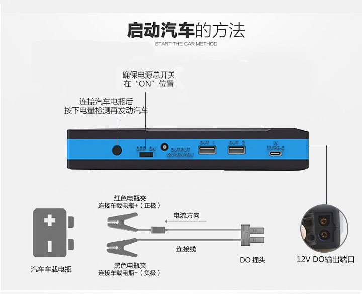 以下是昂佳A26汽車應急電源啟動汽車方法簡略圖,詳細步驟您可移步至:汽車應急啟動電源使用方法及原理圖。
