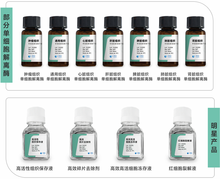 上海凈信推出了一系列針對(duì)不同組織的特異性單細(xì)胞解離酶,專為高質(zhì)量單細(xì)胞懸液制備而設(shè)計(jì)。產(chǎn)品采用了高純度、多元化酶配方,可快速、溫和解離組織樣本,最大限度保持細(xì)胞活性和完整性,適用于各類原代細(xì)胞提取、培養(yǎng)、流式分析、類器官、腫瘤組織解離及單細(xì)胞測(cè)序等研究。